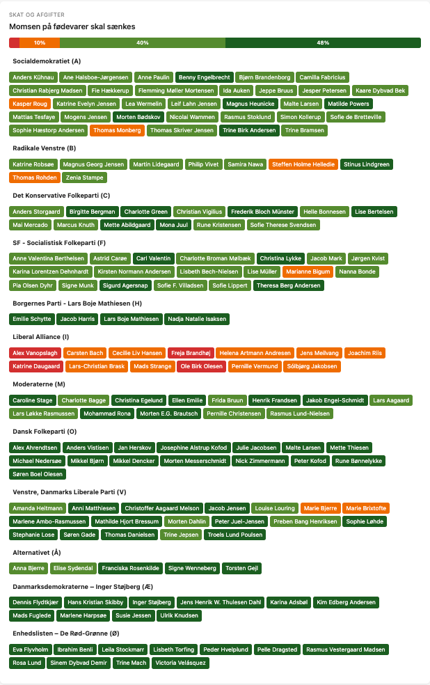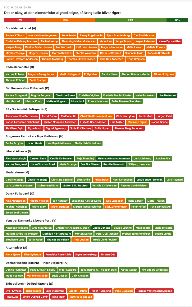 What the test ought to do is ask general questions that separate the blocs first of all. Questions such as “Denmark has a good welfare system, and also the highest tax burden in the world. Should this tax level overall be increased or decreased?”, or “Continued Muslim immigration allows for asylum seekers and family reunification among other things, but also comes with large costs to taxpayers, and in form of increased crime. Are you in favor of keeping the current level of Muslim immigration or reducing it?”