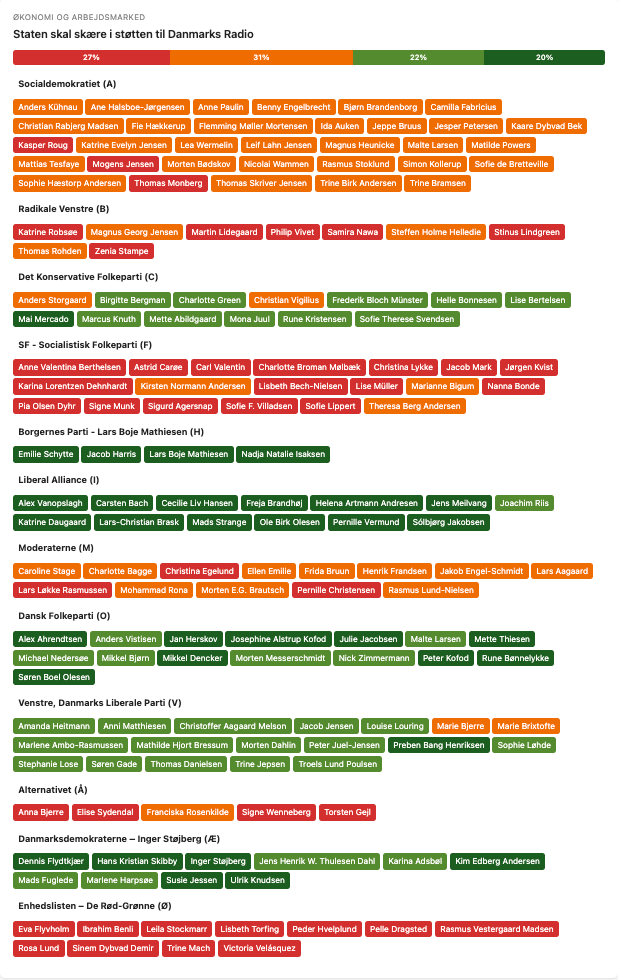 An open political question is whether DR, the public broadcaster, should keep receiving its current, very generous public funding. DR is widely accused of left-wing bias, and this is also reflected in who supports their funding, with all the left-wing parties being in favor, and all the right-wing parties being opposed.