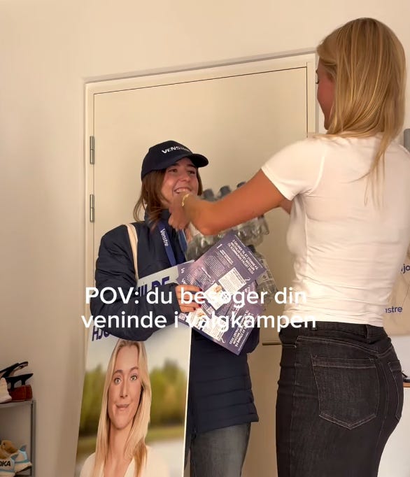 Notice also Mathilde Bressum in this figure. She is a 27-year-old woman who is far more pro-immigration than her party. She also has a more successful instagram than most politicians. Below is one of her posts, which has the TikTok use of POV, which I suppose to them just means “video of”.