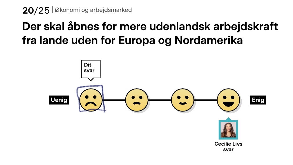 And instead of asking overall about immigration, the test asks questions such as “It is more important that enough staff can be recruited for elderly care than whether they can speak Danish.”