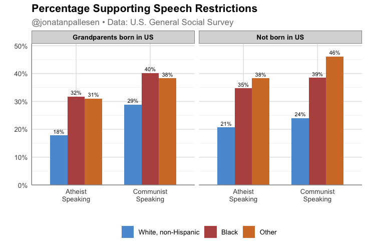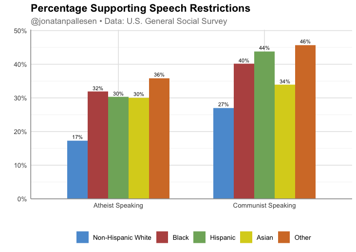 Whites are more supportive of free speech than other ethnic groups.