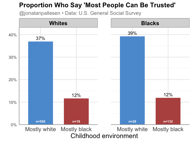 Growing up in majority Black environments means lower trust, both for Blacks and Whites.