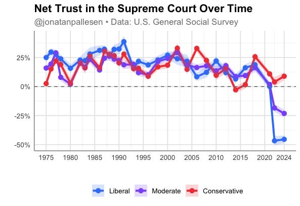 The trust in the Supreme Court has plummetted among liberals lately, after being quite stable for more than 40 years.