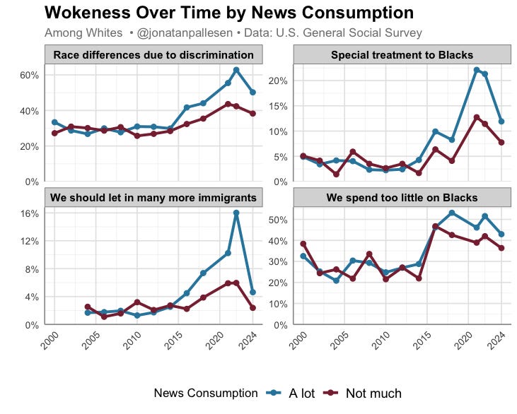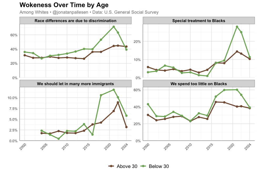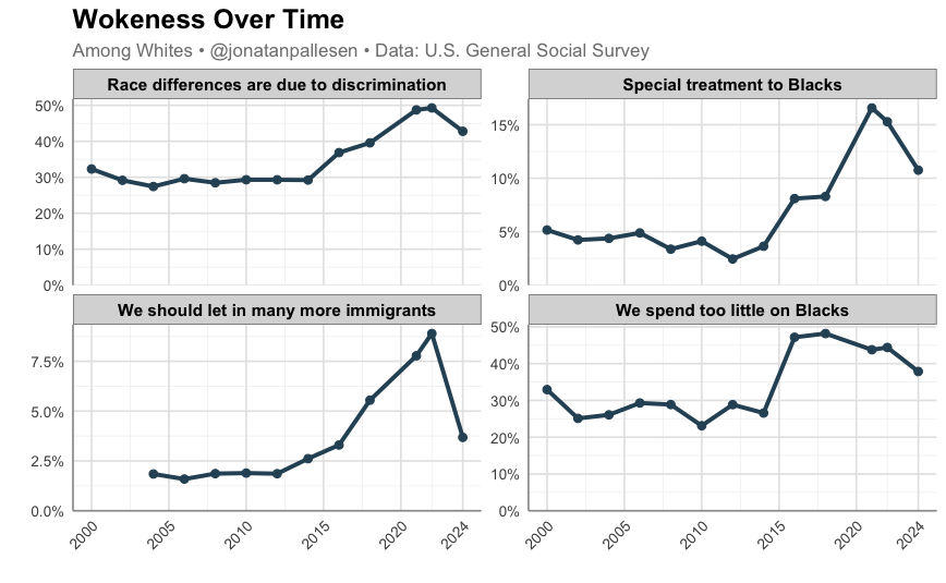 This is an increase especially from 2014 to 2024. But if we look at other questions, we can see that wokeness exploded from 2015 to 2021, and has abated since.