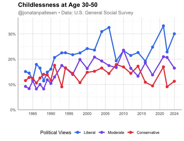 The increase in childlessness over time is only among liberals.