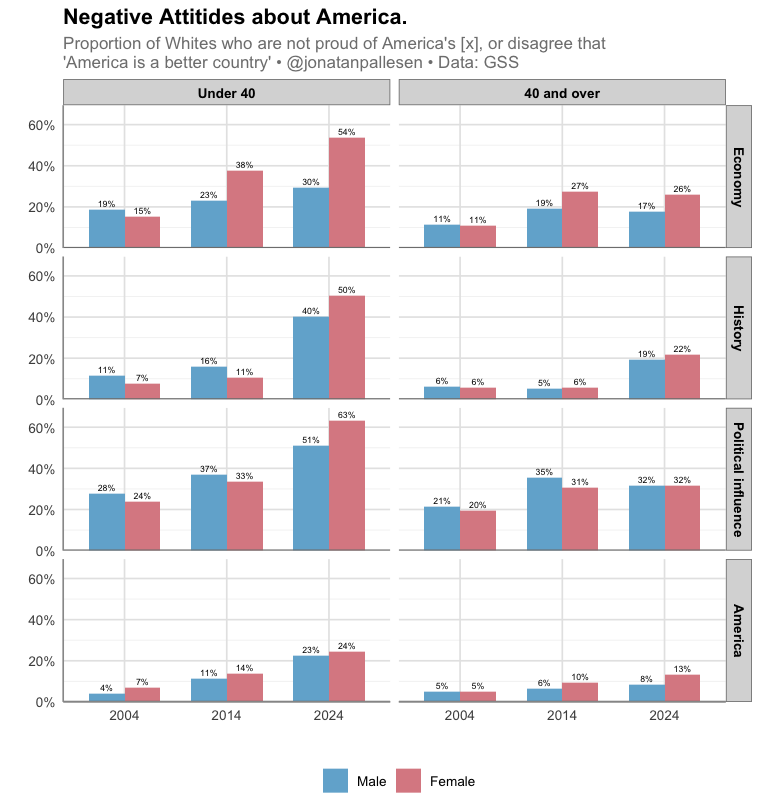 Questions about pride in America and its history has been asked again in 2024 for the first time since 2014. We can see a large increase in negative attitudes about America, especially among young people.